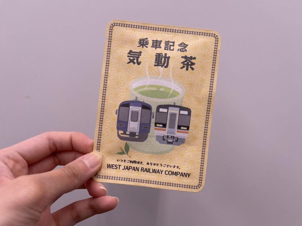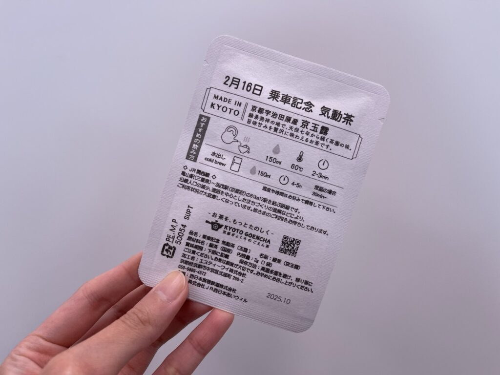 這款茶包造型設計成車票的樣式,正面印有本次搭乘的 KiHa 75 型柴聯車插畫,背面則標註乘車日期「2 月 16 日」,讓人一看到就能回想起當天的旅程。茶包內裝的是高品質的日本綠茶,香氣濃郁,但它可愛的包裝實在讓人捨不得撕開。