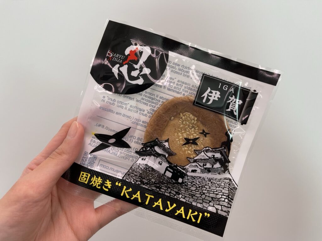 另一個伴手禮是伊賀市著名的傳統點心「堅燒煎餅(固焼き)」。這款煎餅以堅硬著稱,據說是過去忍者攜帶的零食。包裝採用黑色設計,上面印有忍者、手裏劍和伊賀上野城的圖樣,充滿濃厚的地方特色。固焼き煎餅需要用附帶的小木槌敲碎才能食用,是既有趣又美味的點心。