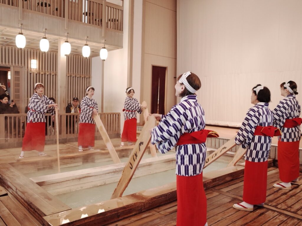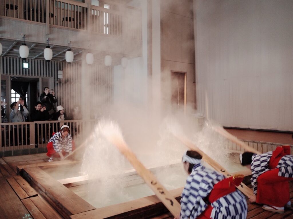 在湯揉表演中,表演者會向觀眾演示,如何利用木板降低溫泉的溫度,並搭配輕快的歌曲。表演途中,表演者會將木板由下往上抬起,溫泉水也會跟著向上飛濺,是非常精彩的表演!