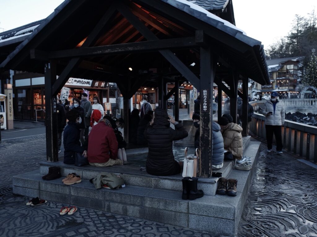 草津溫泉街區有很多足湯,不用怕找不到,像是在湯畑旁邊就有。可以先買個溫泉小饅頭,再帶到足湯這邊,一邊泡、一邊享用饅頭。在冷冷的天走了不少路後,泡個足湯最適合了。