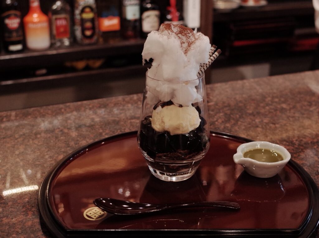 喫茶去的招牌甜點之一「咖啡凍阿芙佳朵」,包含咖啡凍、香草冰淇淋、棉花糖、生奶油、巧克力、脆餅,還會附上一小杯的抹茶。抹茶淋在最上面的棉花糖後會瞬間融化,棉花糖與抹茶會一同融進底部的冰淇淋與咖啡凍。