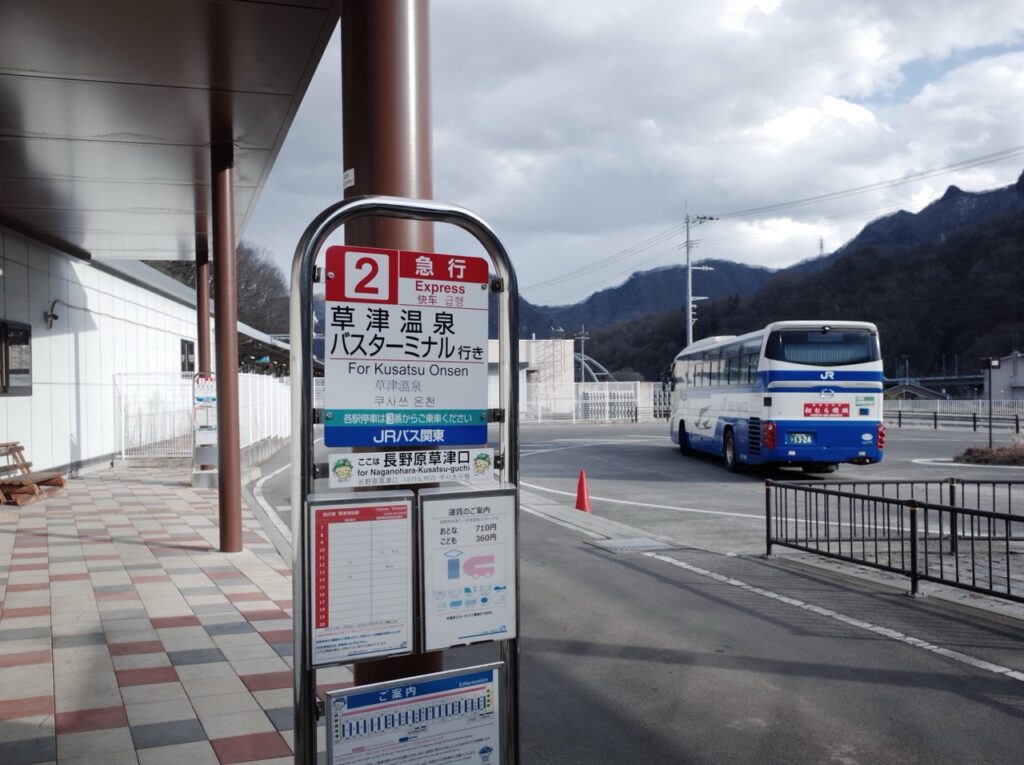 搭乘「四萬・草津」特快列車抵達長野原草津口站後,再轉乘巴士前往草津巴士總站(草津温泉バスターミナル),車資710日圓,大概25分鐘即可抵達。此巴士可以使用交通IC卡付費,非常便利。