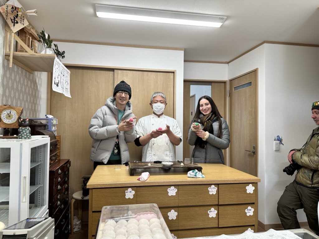 散步沿途探訪店家,首先來到的是一家位於遠野市的和菓子店「鶴乃屋」。「鶴乃屋」提供各式傳統日式甜點。店內的和菓子種類豐富,深受當地人和遊客的喜愛。來到這裡,安排了跟著老闆菊池國博親手體驗製作和菓子。很好奇老闆會教我做出什麼造型的和菓子呢?答案是遠野的傳說,河童的模樣。據說其他地方的河童都是綠色的,但遠野的河童以紅色為主,因此我的河童和菓子也是紅通通的一張臉。做得像嗎?我的成品雖然看起來不怎麼樣,但應該還過得去啦,畢竟,河童本來就是傳說中的生物嘛,應該沒有一定的樣子吧!總之是很有趣的過程,推薦來嘗試看看。
