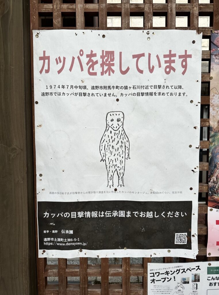 遠野車站外的公布欄,貼了一張尋人啟事的海報,醒目的紅色標題寫著「尋找河童」,底下認真地寫著:「自從1974年7月中旬,有人在遠野市目擊河童以後,迄今再也無人看到牠們的蹤跡。如果目擊河童,請與我們聯繫!」海報上甚至還有插畫,是一個河童的身影,來自於畫家依據當年目擊者的口述,畫出牠的樣子。