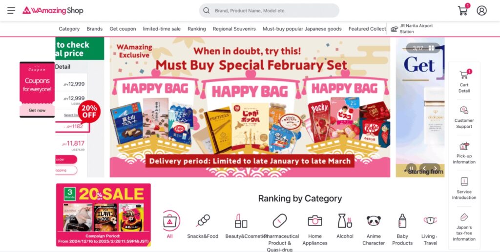完美行購物 WAmazing Shop 提供日本各地的特產家電、美妝產品、酒類、保健食品等,讓旅客能輕鬆地購買日本各式各樣魅力十足的商品。