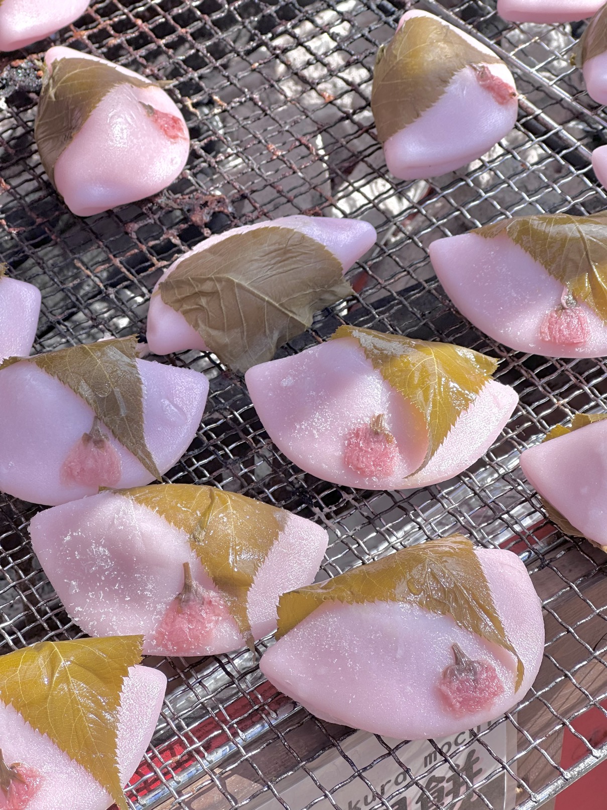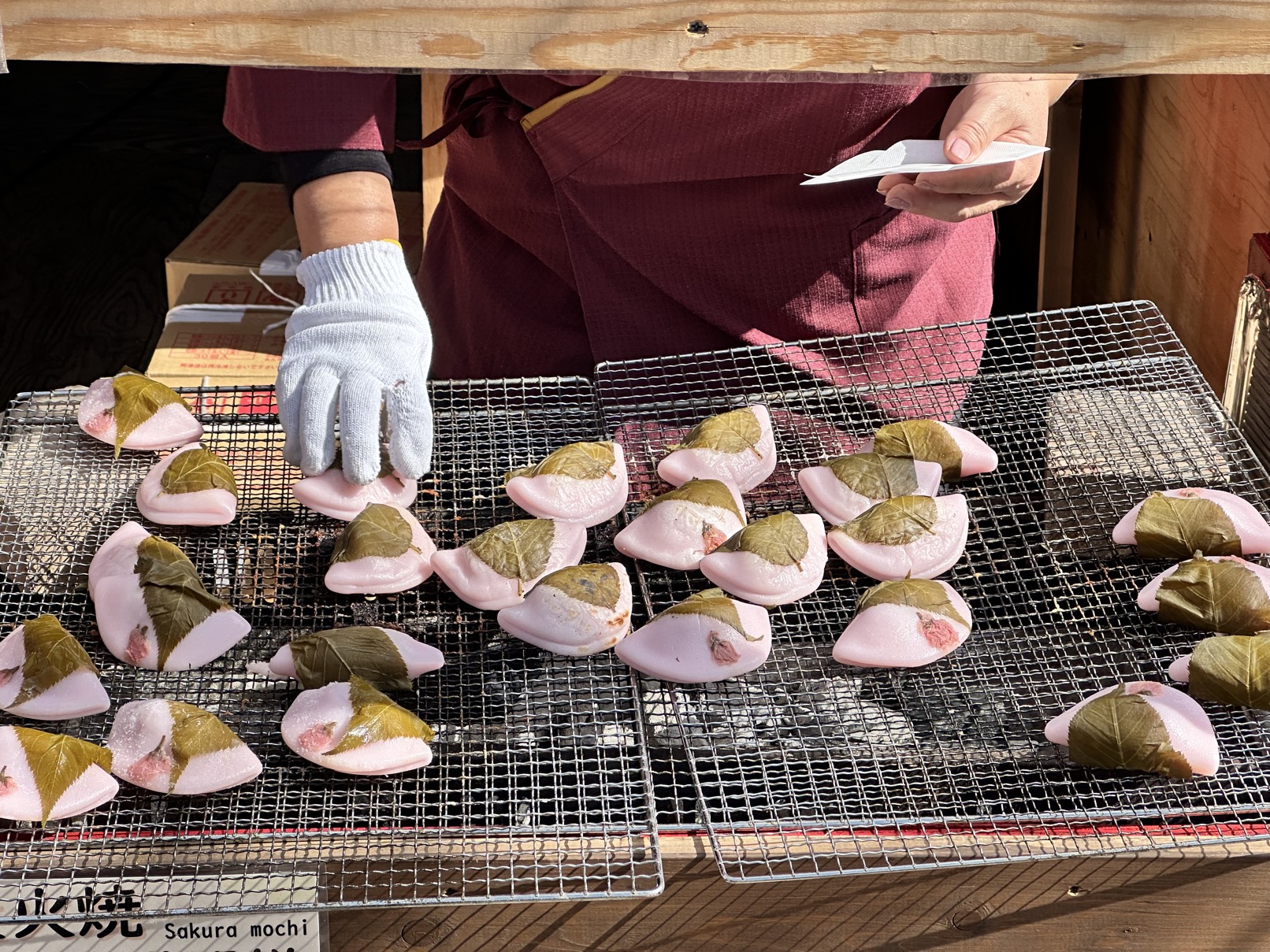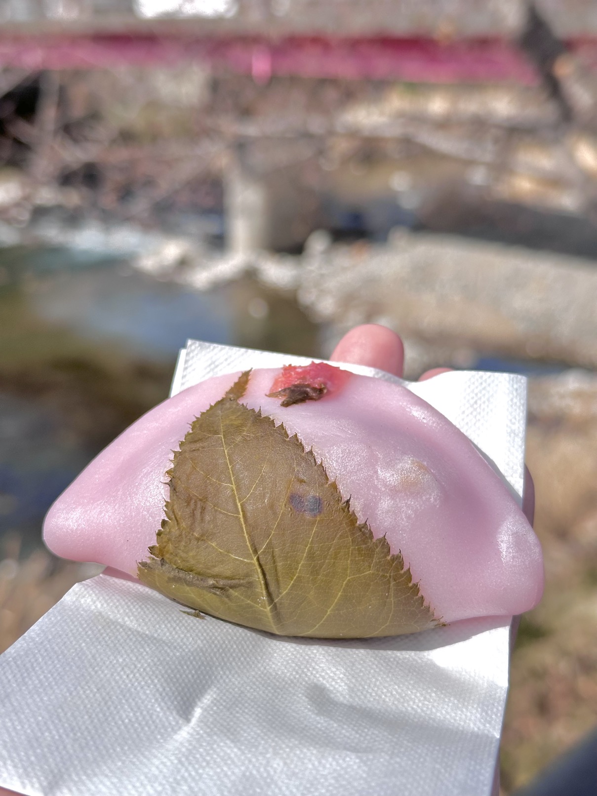 河津櫻沒怎麼看到,但吃的不能少。我們吃了今年第一個「櫻餅」,很特別的是用烤的,熱騰騰的皮吃起來更加柔軟。紅豆餡連著帶點鹹味的葉子一併吃,櫻餅的滋味是很大人味的。