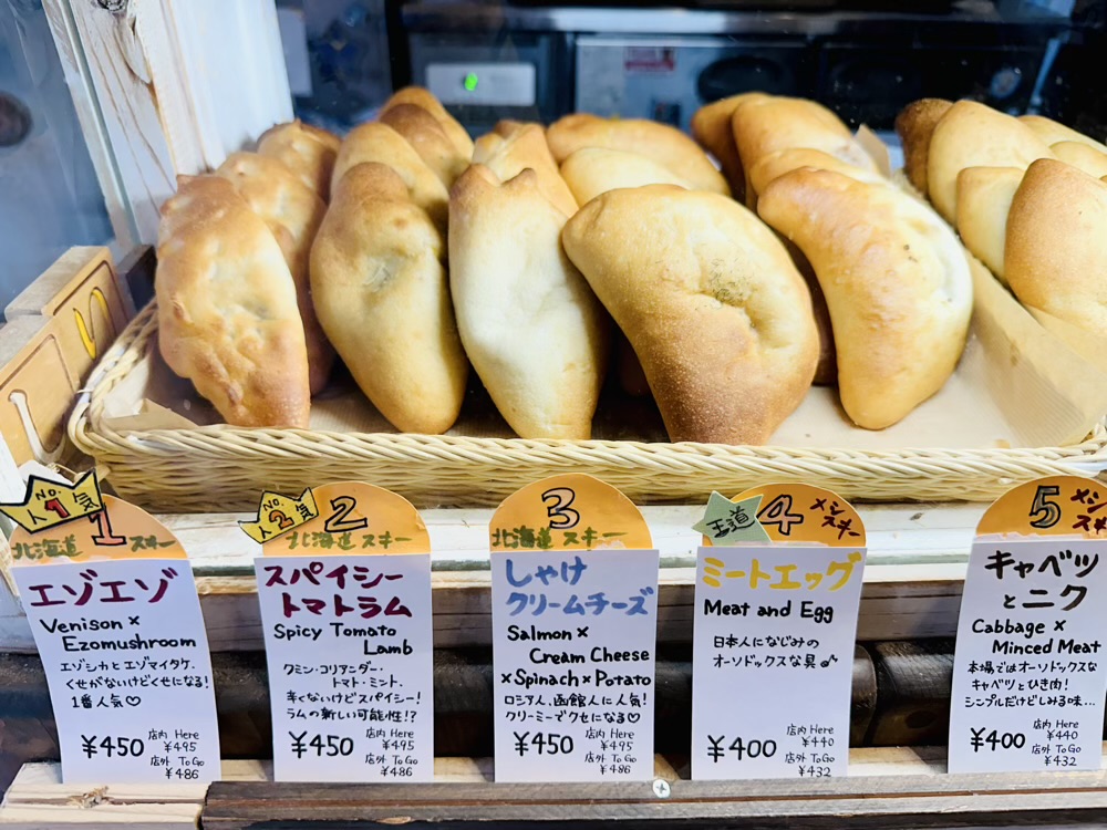 這裡主打的俄羅斯家常料理,充滿手作的溫度與異國情調。招牌菜包括現烤的「烤皮羅什基」(焼きピロシキ),那是一種包裹絞肉和蔬菜內餡的酥脆麵包,店裡多達數十種以上的口味,看了每一樣都好想吃。