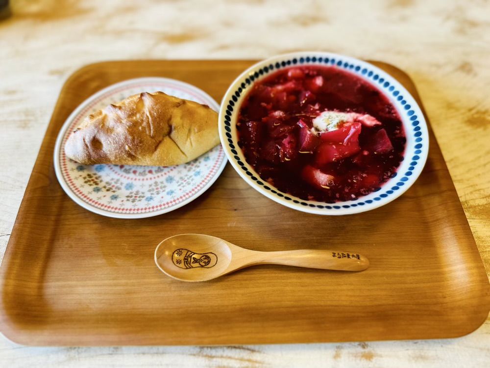 搭配烤皮羅什基一起吃的,是羅宋湯(ボルシチ)。湯的種類很多,樣貌跟我印象中羅宋湯的形象很不同。例如像是有加蛋的蔬菜湯,非常清爽,另外還有湯頭濃郁、色澤鮮紅,採用甜菜根熬煮的口味,滋味溫潤帶酸,相當開胃。