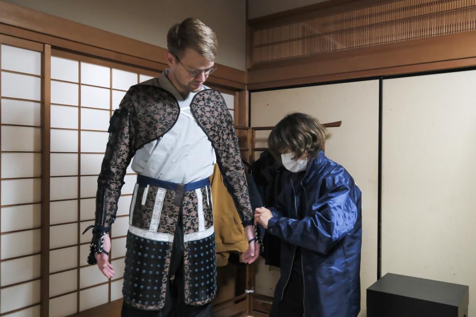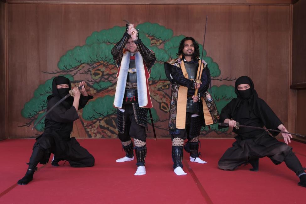 在岡崎城二之丸能樂堂前集合後,專業團隊將協助你穿戴全套甲冑,並進行殺陣動作的基礎教學。殺陣是一種源自武士時代、融合表演與武術的傳統技藝,你將學習拔刀、迎戰、防守等招式,並在安全指導下與「忍者」對戰,完成一場精彩的表演實戰。