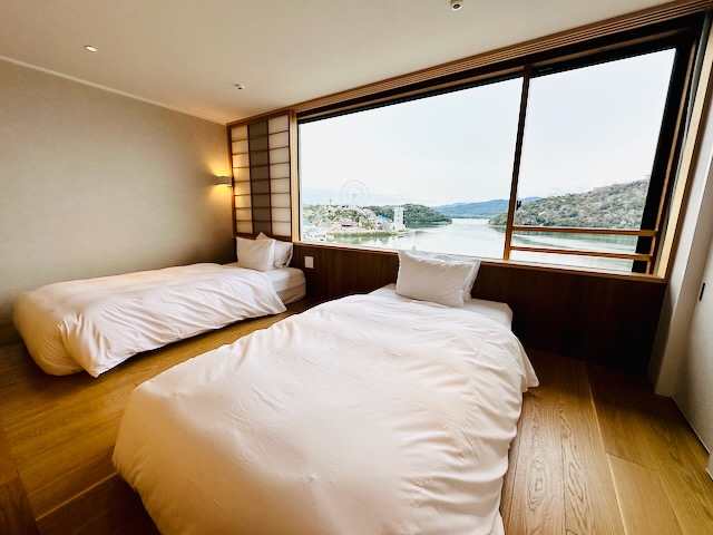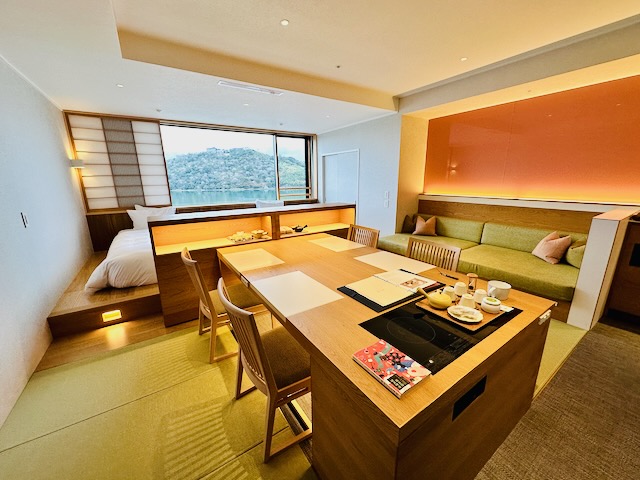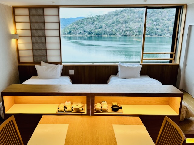 一走進飯店,我就聞到整個空間飄散著淡雅茶香。這股茶香一直延伸到客房裡,原來是在飯店的許多角落,都放著燻烤著茶葉的熏香燈。推開客房大門,有如一幅山水畫似的濱名湖美景,攤展在眼前,彷彿讓房間空間有了無限的延伸。客房風格承襲星野「界」系列的「當地魅力房」概念,設計靈感來自「遠州七窯」與茶器之美,房內設有專屬茶具組,讓人可隨心沖泡靜岡茶,慢慢品味。