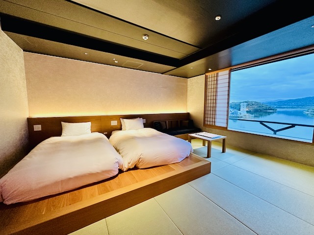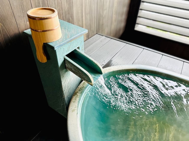 較大的房型內附設有專屬泡湯空間,邊泡湯邊欣賞濱名湖美景,隱私中又保有視野的遼闊。當然,若喜歡更寬敞的泡湯浴池,那麼到旅宿的大眾池亦是絕佳體驗。大浴場分為室內湯與露天風呂,其中還帶有靜岡特色的「茶香湯」,每日會在湯池中放入茶葉袋或茶樹精華包,讓溫泉水中飄散出溫潤茶香。入夜後點燈,戶外浴池的氛圍更加幽雅靜謐。
