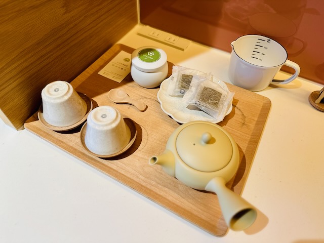 旅宿大廳的公共休憩區設有一處名為 「茶葉吧(お茶BAR)」 的專區,也是此處重要的特色之一。這裡備有多款茶葉,如煎茶、焙茶、玄米茶、紅茶等,每種茶旁皆附有說明卡,介紹香氣、口感與適合的沖泡溫度。可依喜好現場沖泡試飲,也可以將喜愛的茶葉帶回客房慢慢品味。