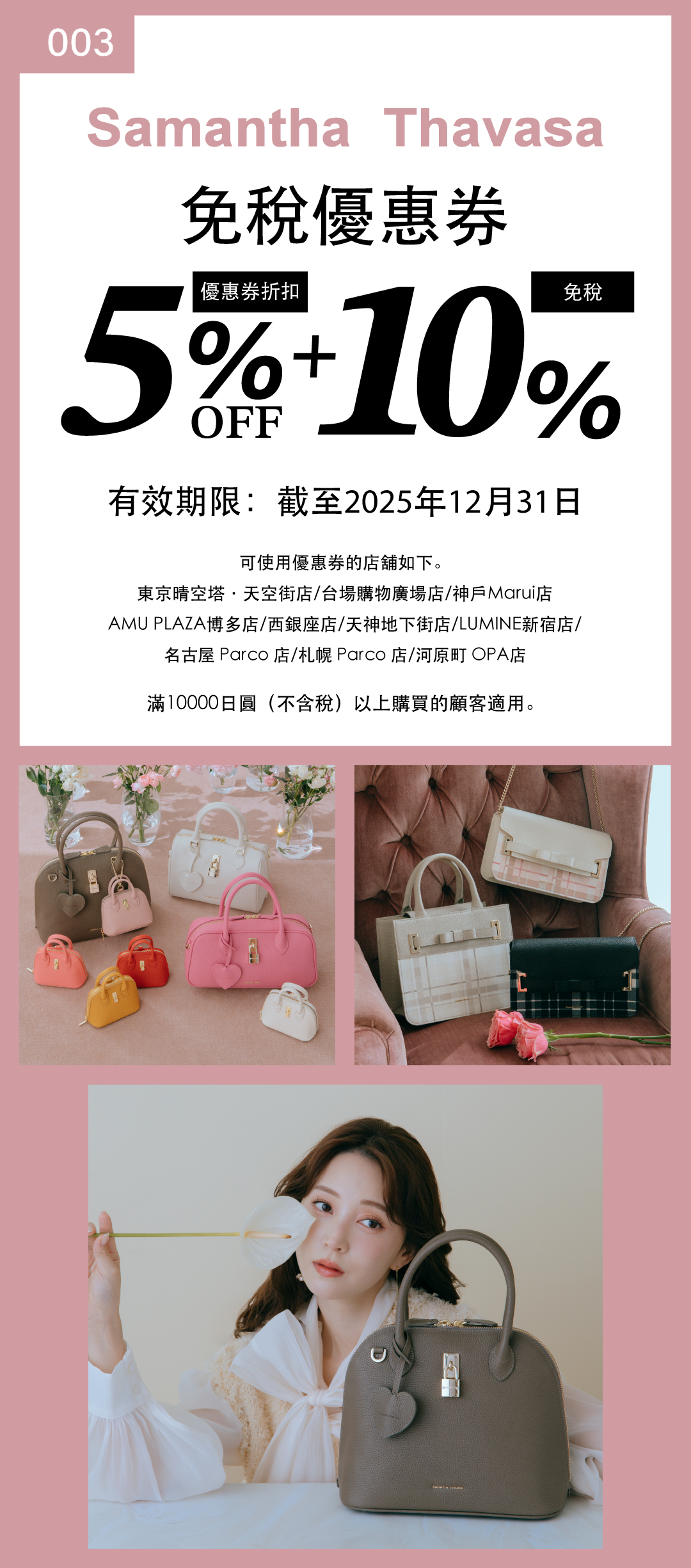 只要在結帳前出示這張「免稅10%+額外5%折扣」的專屬優惠券,並滿1萬日圓以上消費,就能在日本全國的 Samantha Thavasa 專櫃使用。使用方式簡單方便,商品種類不限。