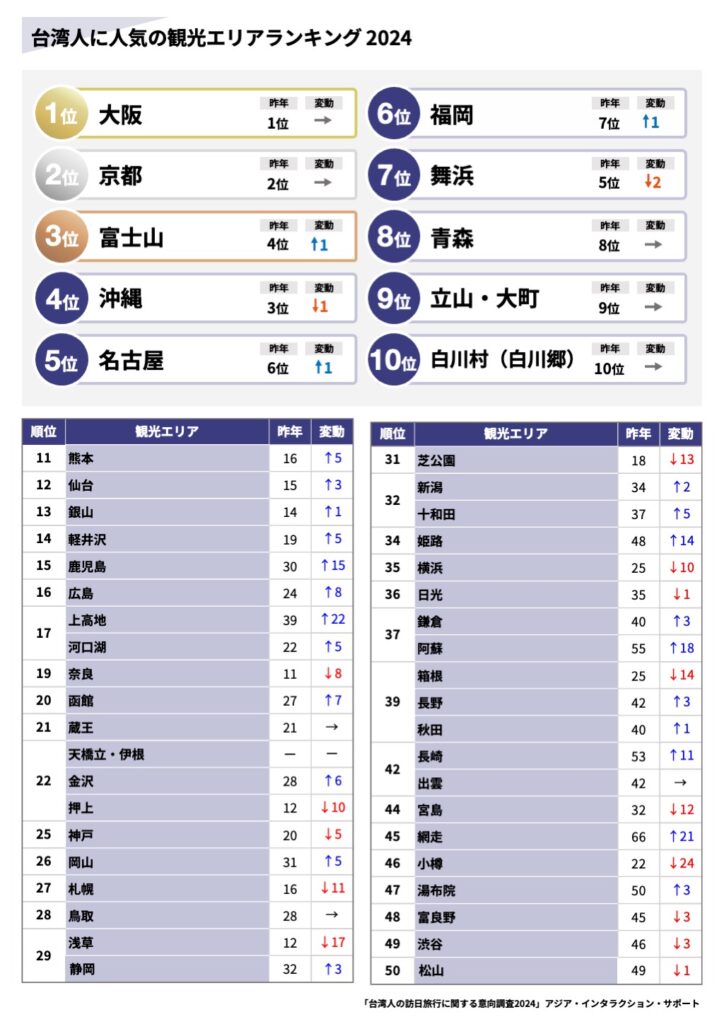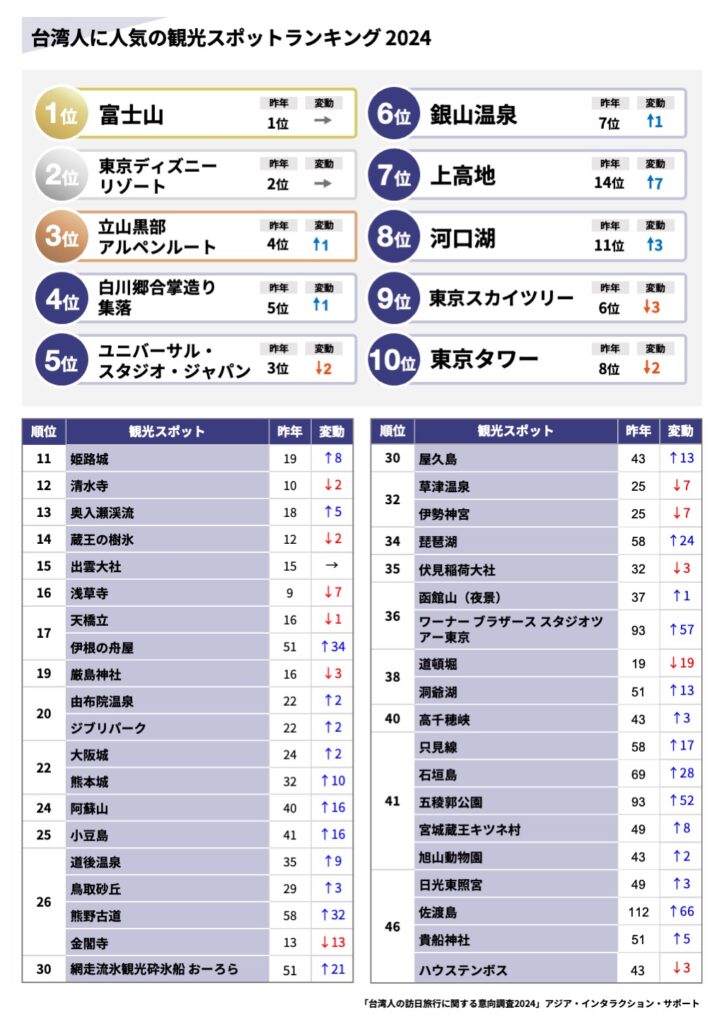 富士山與迪士尼樂園受到首次訪日者與回訪者的廣泛喜愛,再次鞏固其作為日本觀光象徵的地位。而像是立山黑部阿爾卑斯路線、白川鄉、上高地、河口湖等,可以欣賞四季風光與歷史街景的地方,也大幅提升名次。這樣的趨勢與現今遊客希望避開人潮、靜心療癒的旅行傾向不謀而合,反映出台灣旅客對旅遊價值觀的轉變。