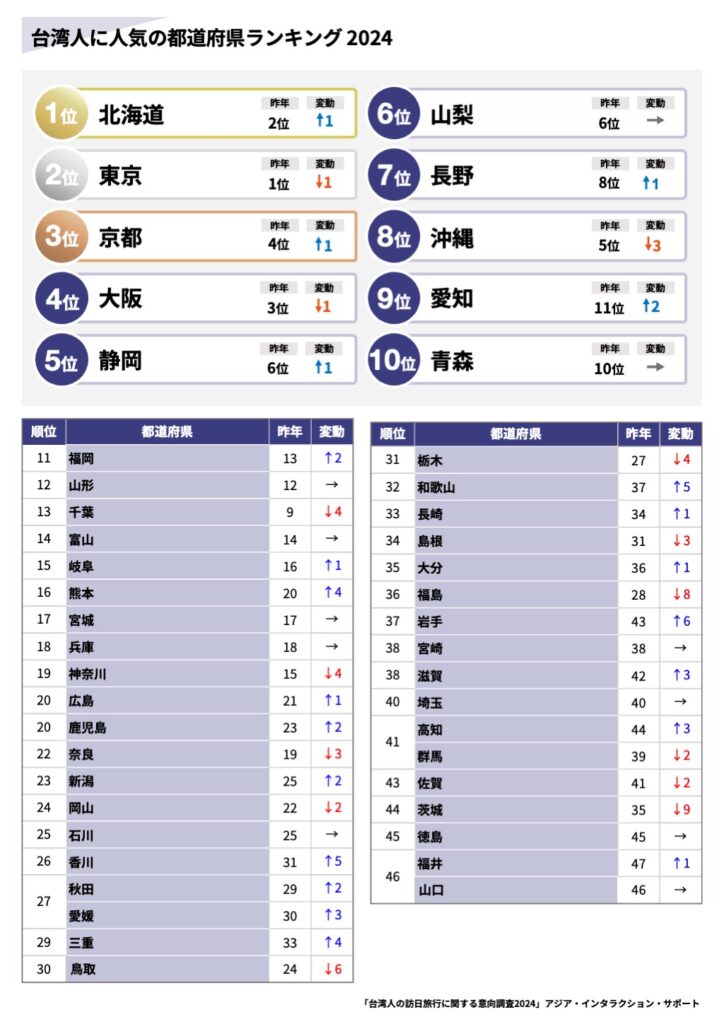 在都道府縣的人氣調查中,「北海道」取代去年第一名的「東京」,重新登上冠軍寶座。受到富士山與上高地高人氣的帶動,「靜岡」與「長野」的名次各上升一位;而「沖繩」則下滑了 3 個名次。