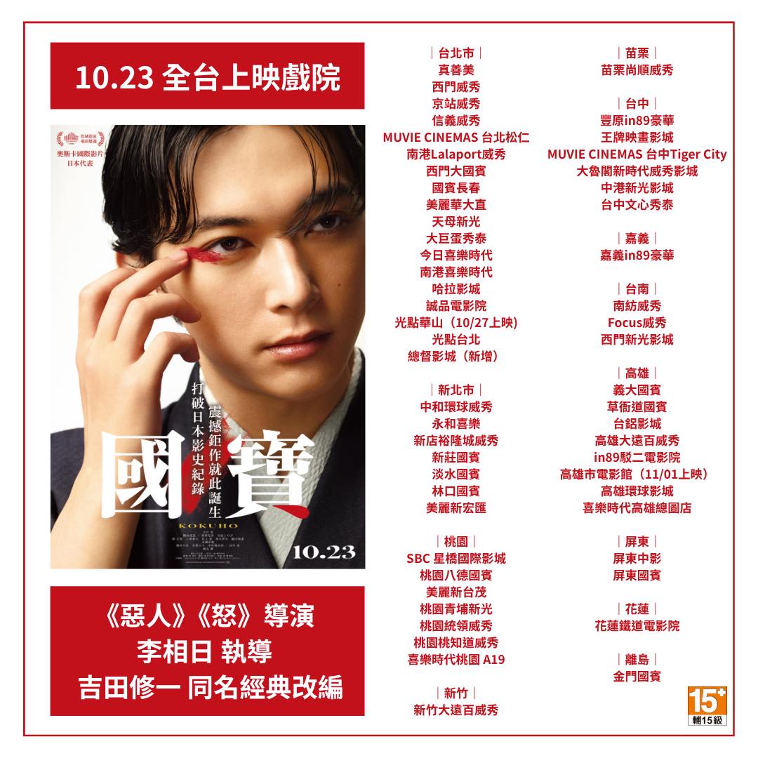 台灣已確定會上映《國寶》,將由傳影互動代理在台發行,目前上映定在2025年10月23日(四)全台戲院盛大上映