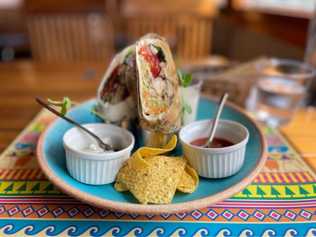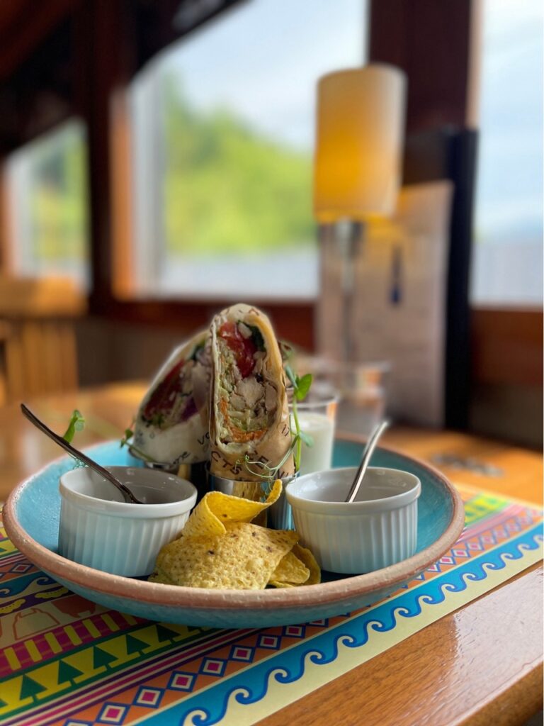 兩款主食「森之玉米捲餅(森のトルティーヤ)」與「海之玉米捲餅(海のトルティーヤ)」分別象徵京都內陸與沿海的風味。前者夾著但馬雞肉與酪梨醬,搭配 BBQ 醬,味道溫潤濃郁;後者則使用宮津竹輪與丹後鰯魚,搭配清爽的酸味高麗菜沙拉,口感特別又帶點海鮮的鹹香。