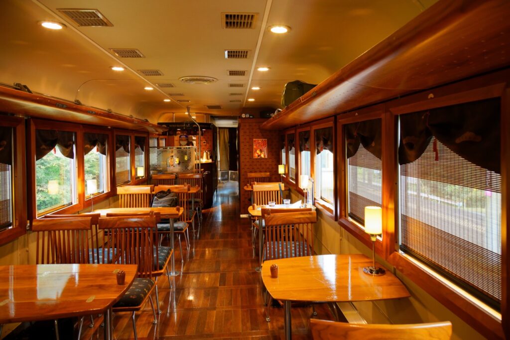 我搭的就是這台!全車採用深色木質裝潢,有專屬服務人員提供早午餐套餐、甜點與在地茶點。車窗大、座位舒適,還能邊用餐邊欣賞窗外風景。需要事先預約指定席,並且是特別為用餐設計的列車。