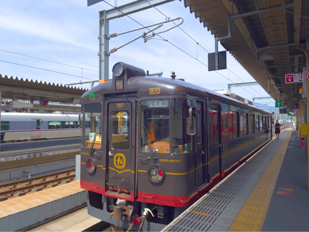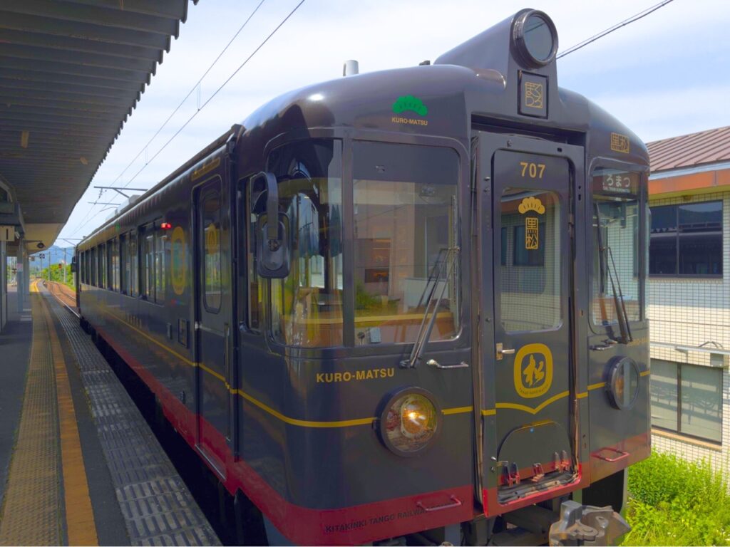 這次我搭乘的是需要預約的「黑松號(くろまつ号)」,是結合美食、設計與在地特色的觀光列車。丹後鐵道其實還有另外兩輛設計與人氣同樣不輸的觀光列車,分別是酒紅色的「赤松號(あかまつ号)」與靛藍色的「青松號(あおまつ号)」。很幸運地,沿途我也拍到另外兩台觀光列車!這三台列車不僅外觀風格獨特,車內裝潢與行駛路線也各具特色,是鐵道迷來丹後必拍的三兄弟!
