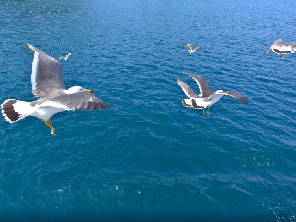 然而讓我最意外的,並不是風景,而是那些一路陪船同行的海鷗與水鳥。剛起航沒多久,就有幾隻鳥兒出現在船的周邊,接著越來越多,最後幾乎成群與船隻隨行翱翔。船上的其他旅人早有準備,拿出在售票處買的海鷗餅乾,一邊用零食吸引鳥兒一邊拍照,笑聲與驚呼聲此起彼落。