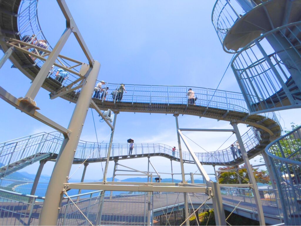 最受歡迎也最有趣的就是那座「空中腳踏車(サイクルカー)」,雙人座的腳踏車隨著自己的腳步踩踏移動,懸空的軌道邊沒有玻璃也沒有牆,可以直接感受微風擦過臉頰的涼意。此時,俯瞰著天橋立那條如龍般延伸的沙洲,彷彿真的有一條龍從水中躍出、翻身!
