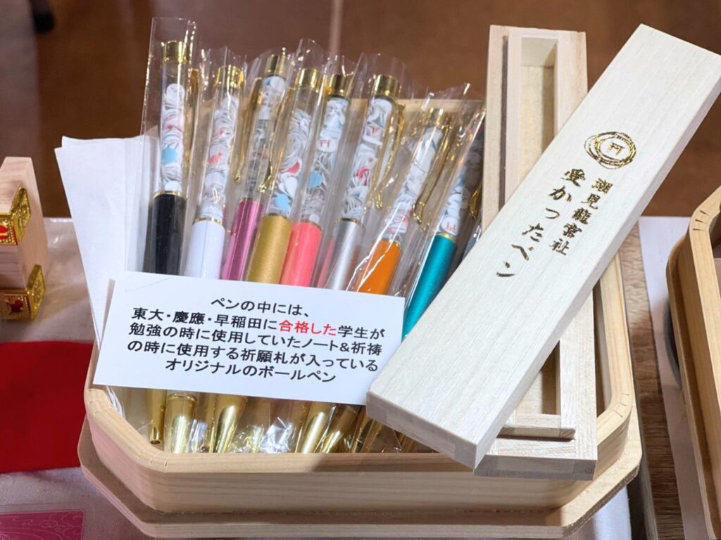 神社也販售許多設計感十足的御守與實用小物,像是印有合格祈願字樣的考試專用筆,是學生和家長很喜歡的伴手禮之一。