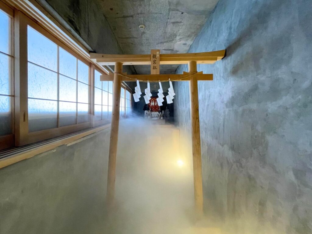 潮見龍宮社最令人驚艷的,就是那條會升起「雲海」的參道!每隔一段時間,會有濃濃的煙霧從地面升起,霧氣彌漫整個步道,在燈光的映照下,彷彿踏入傳說中的龍宮世界。這並非單純的視覺裝置,更是一種過渡儀式,讓人在參拜前沉靜心靈、洗滌思緒的引導設計,從現實切換至祈願的狀態。