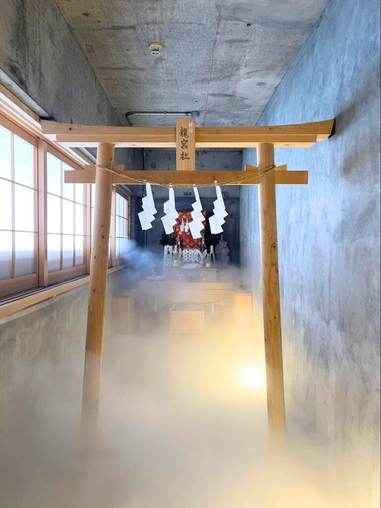 神社之所以選址於這棟與運河相連的大樓內,正是因為龍神是水的象徵,也是一切流動、進展、升騰的能量來源。據說龍神所到之處,萬事順利、因緣展開。與運河相通的水面會隨時間呈現不同深淺,也象徵人生中的變動與前進。