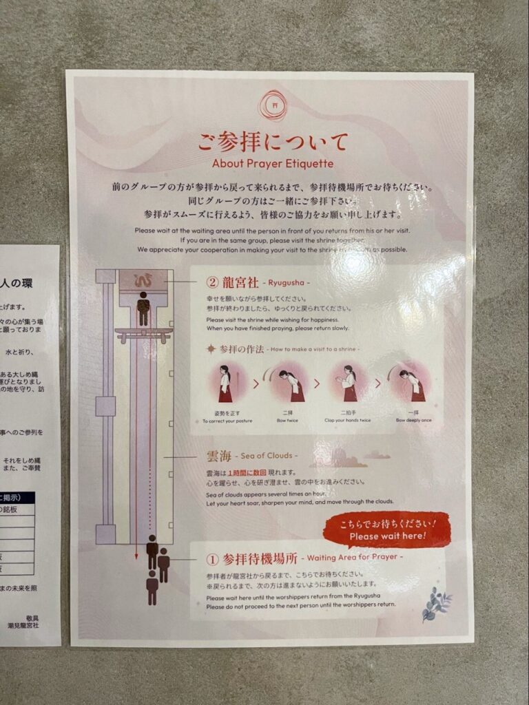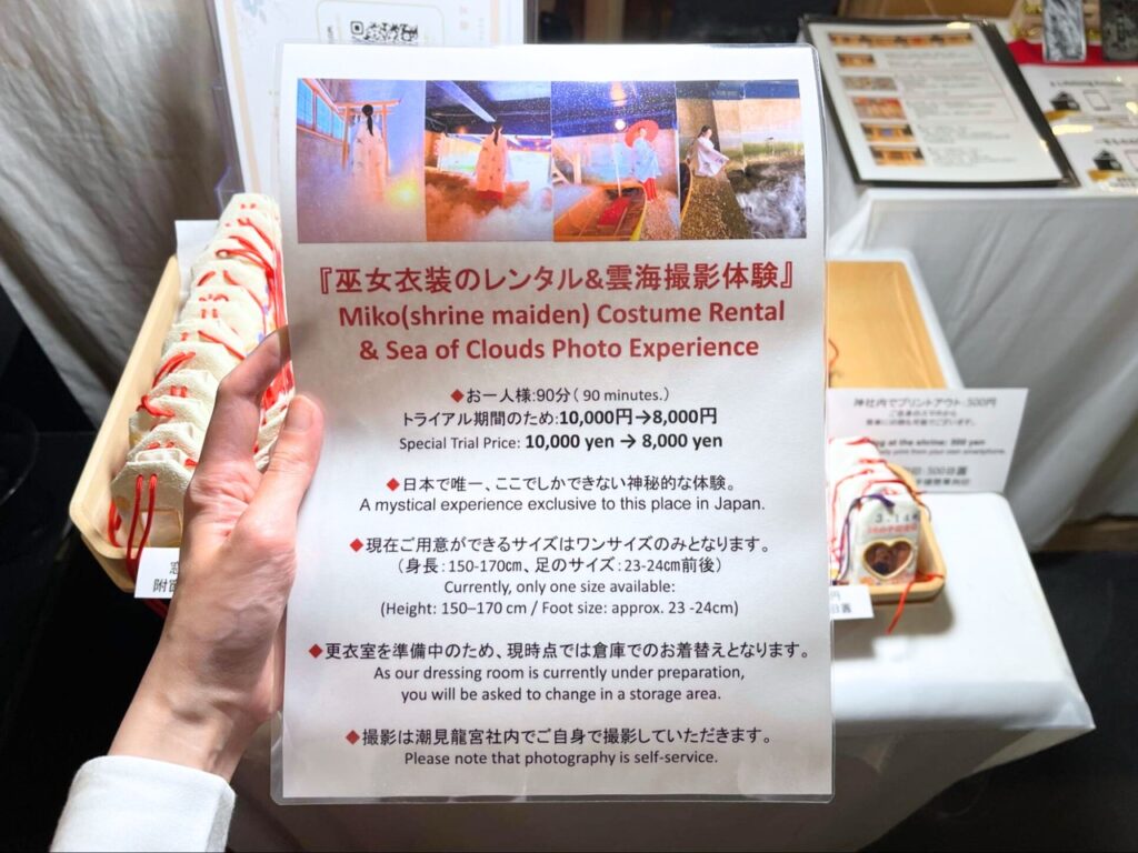 如果想更深入體驗,神社也提供「巫女服體驗」選項。換上傳統巫女裝,走進雲海參道中祈願,不只好拍,更是心靈上的角色轉換。從走進雲霧的那一刻起,你已經不再只是觀光客,而是這座龍神神社中託付心願的一份子。