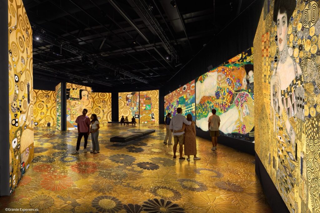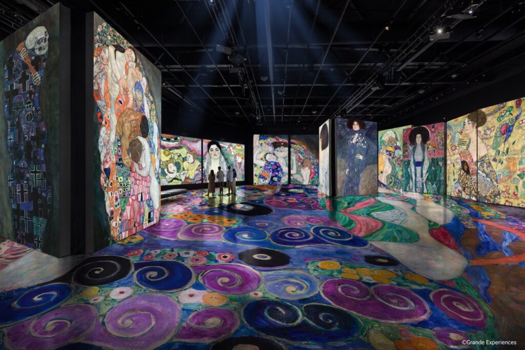影像投射在四周牆面與地板,觀眾彷彿被克林姆的藝術完全包覆,作品中的聲光效果、強烈的裝飾色彩、黃金元素,與豐富的情感在空間中流動,作品宛如注入生命般鮮活,帶來震撼心靈的感受,能以更多元的方式體驗克林姆名畫。