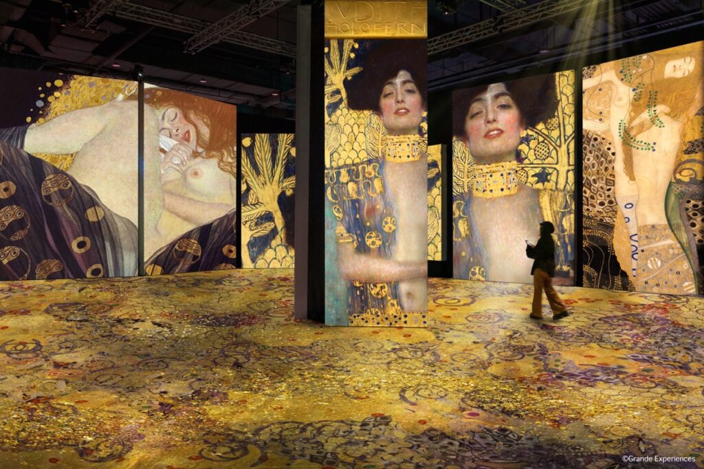 展覽透過挑高 7 公尺高的空間內設置的巨型螢幕、巨大 360 度投影與環繞音樂,把克林姆的代表作《吻》、《茱蒂斯》、《生與死》等名畫一一立體化呈現。