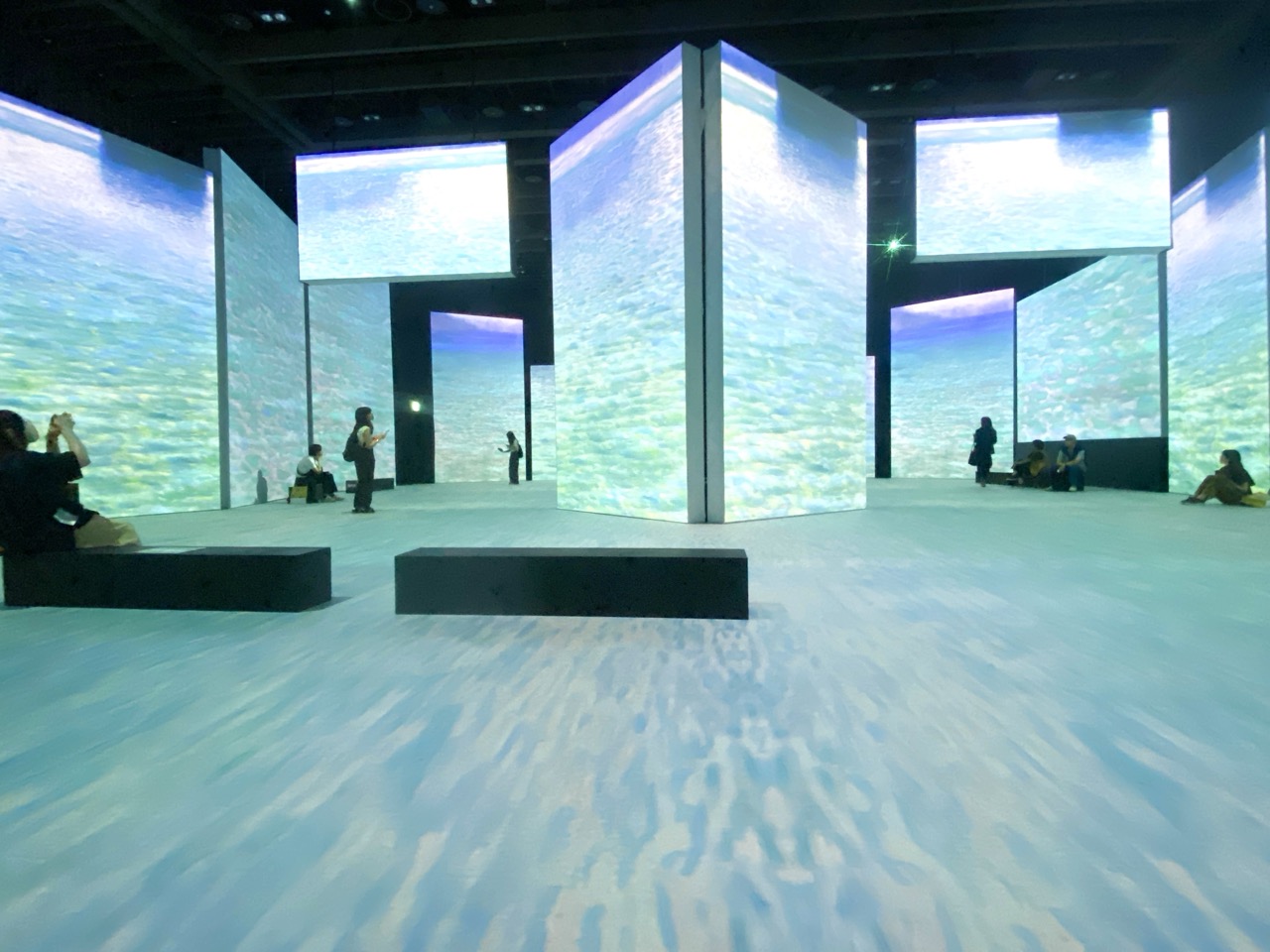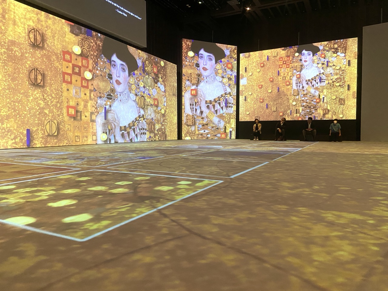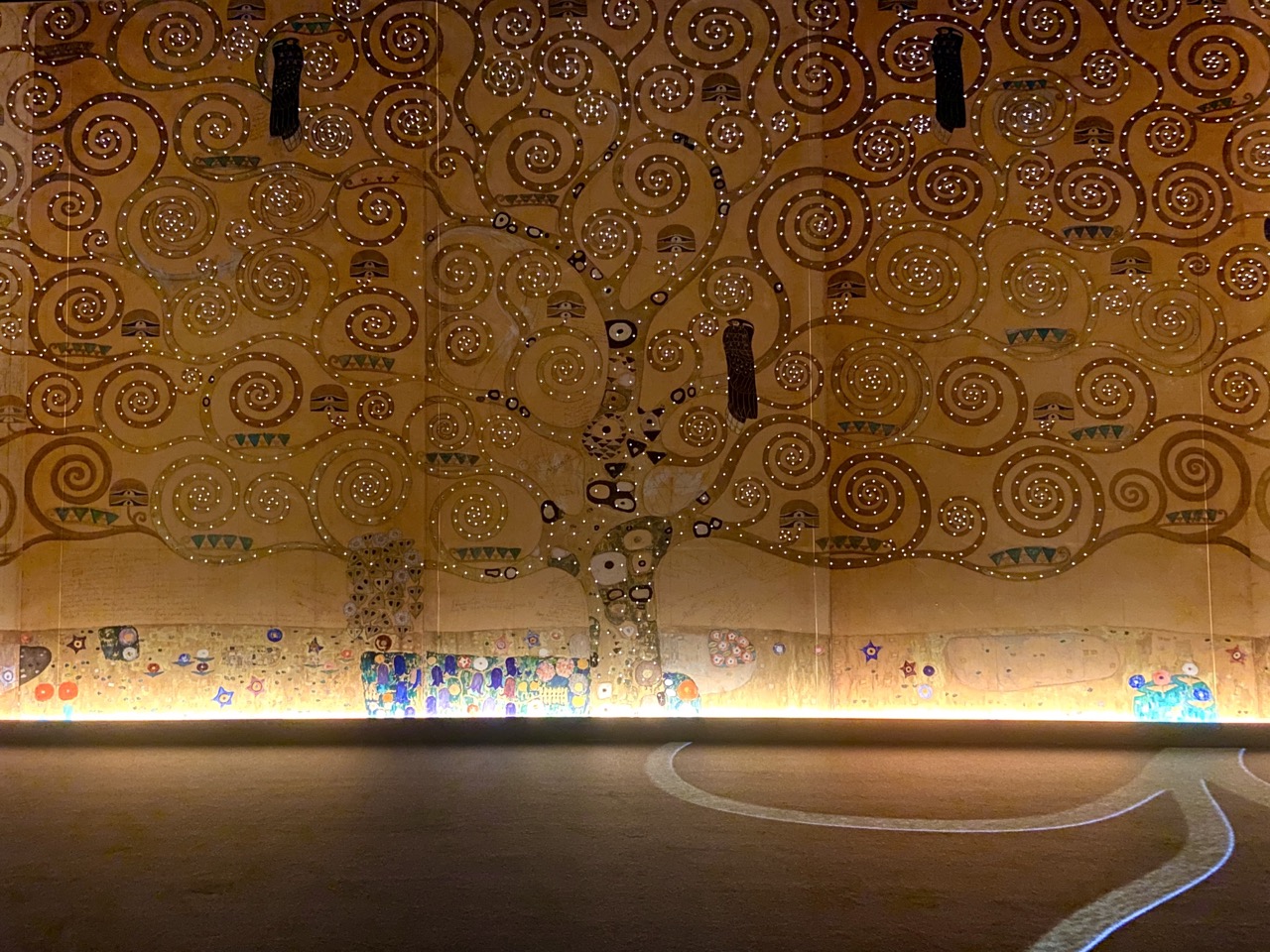不止是巨型投影幕,連地板也是展覽的一部分,每一段以主題方式呈現,整個空間帶出克林姆不同時期的畫風、不同的想法,讓人想更了解畫中意義。