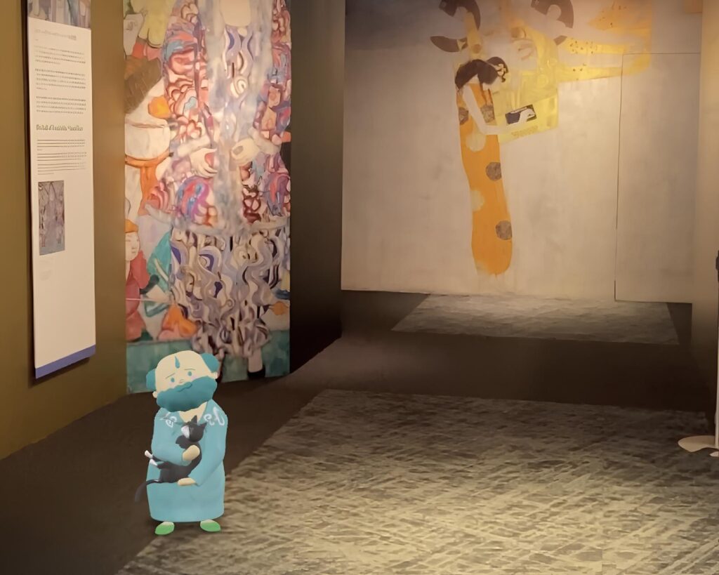 最可愛的部分是,進入主會場前的畫作導覽區,還能找到卡通版的貓奴克林姆,掃描QR-CODE後,藉由AR技術,讓卡通版的克林姆和貓咪,在現實世界開心的玩了起來,科技與藝術的結合,有深度又有歡樂度,非常推薦!