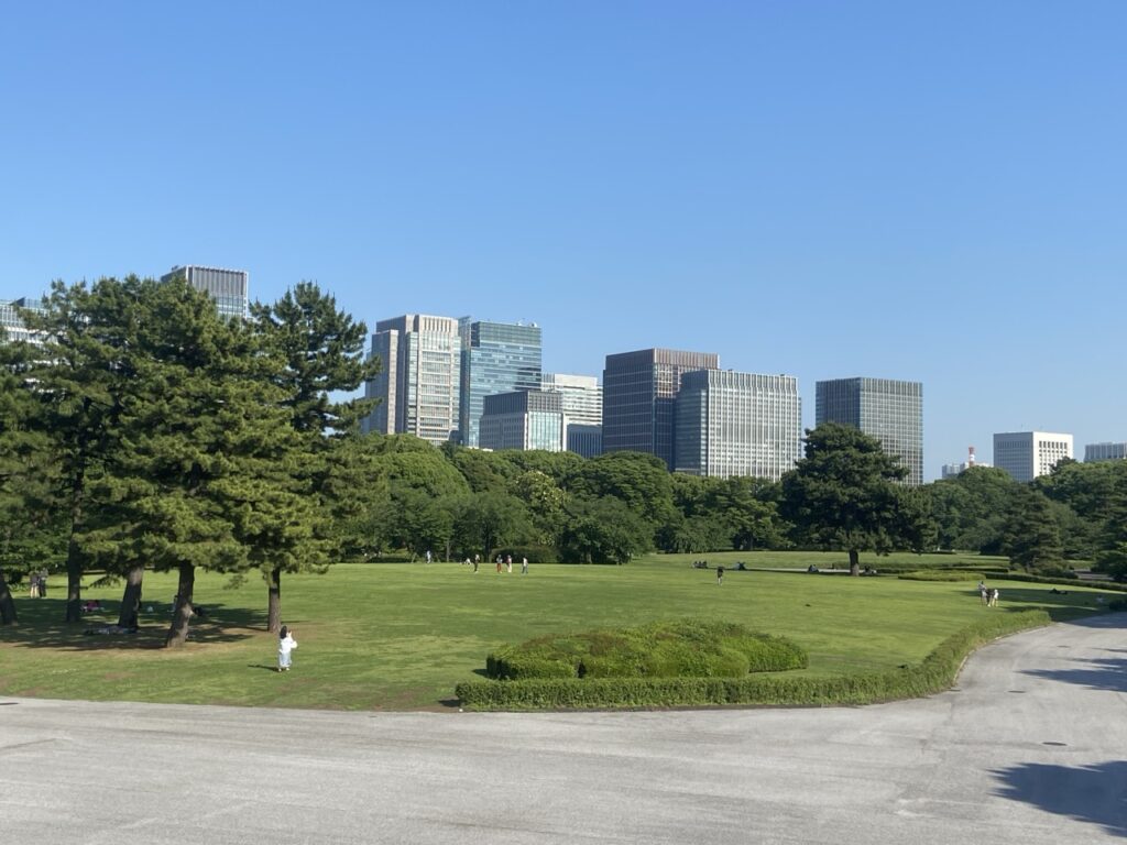 廣大的草坪上經常看到親子鋪野餐墊、享受日光浴,也能看到旅人自在的散步,這裡是「江戶城本丸遺址(江戸城本丸跡)」,過往是江戶幕府將軍居住和辦公的地方,歷經多次地震及火災而燒毀或倒塌,現早已不復存在,但站在這片遼闊空地,或由「天守閣遺跡」俯瞰,依舊能感受當年城郭的宏偉規模。
