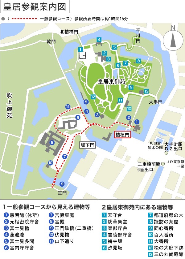 參加皇居一般參觀時,所有預約成功者與當天整理券旅客會集合成一支隊伍,由宮內廳職員帶領,步行約 2.2 公里、約1小時,完成下列固定路線: