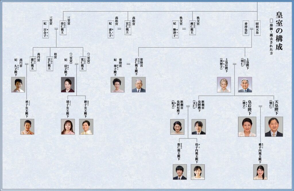 日本皇室目前有四個宮家:秋篠宮、常陸宮、三笠宮和高圓宮。宮家的運作機制是,若宮家誕生男孩,宮號將由其世襲。然而,現今只有秋篠宮家有可繼承宮號的男孩(悠仁殿下),如何確保皇族人數成為當務之急。