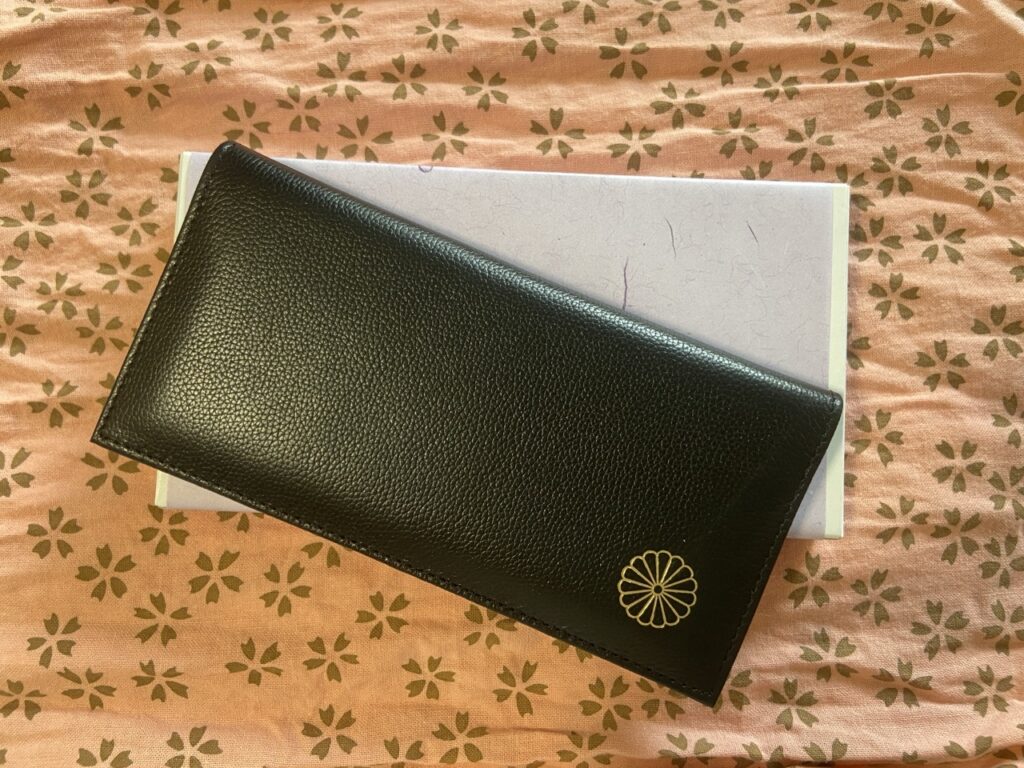 選用高品質的牛皮皮革製成,手感溫潤,耐用性佳。皮夾一角是象徵日本皇室的十六瓣八重表菊紋(菊花徽章)的低調壓紋,簡單大方的設計、尊貴優雅的氣質,具紀念價值又非常實用。由職人手工製作的真牛皮皮夾的價格驚人的便宜,照片中的長夾,2000日幣(2025年6月價格)、品項共有小零錢包、短夾、長夾⋯⋯等,皇居並非以營利為主,職人手作的皮夾直接運至皇居的紀念品店販售,才能如此物美價廉。