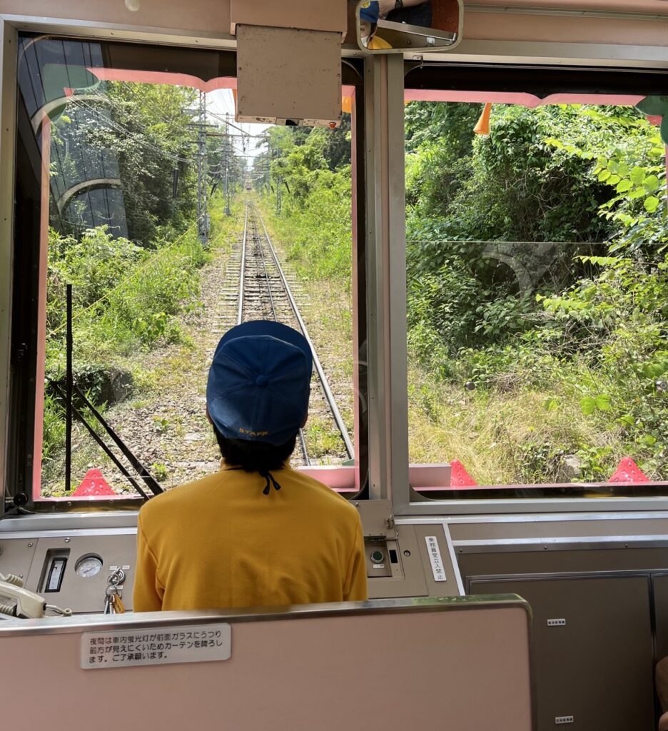 從這裡開始,一段緩緩上山的纜車之旅便會展開。搭上那台造型可愛的「生駒纜車(生駒ケーブル)」,穿過樹影與微風,沿著山坡緩緩而上。