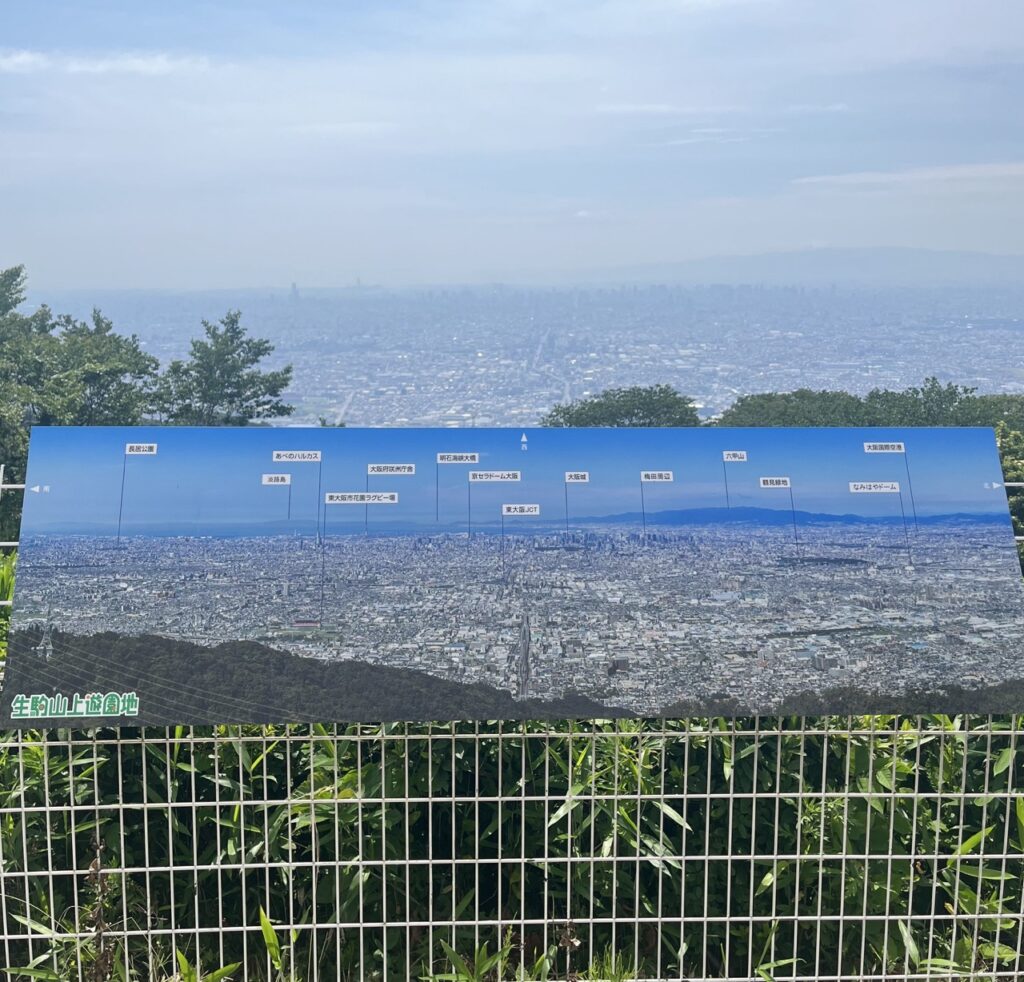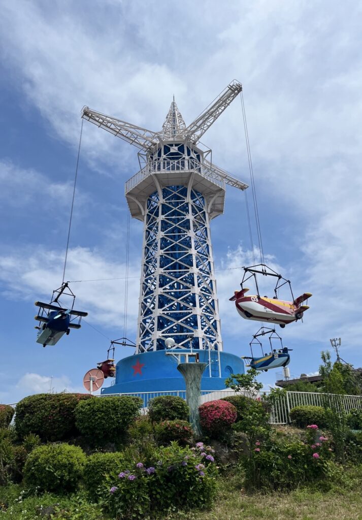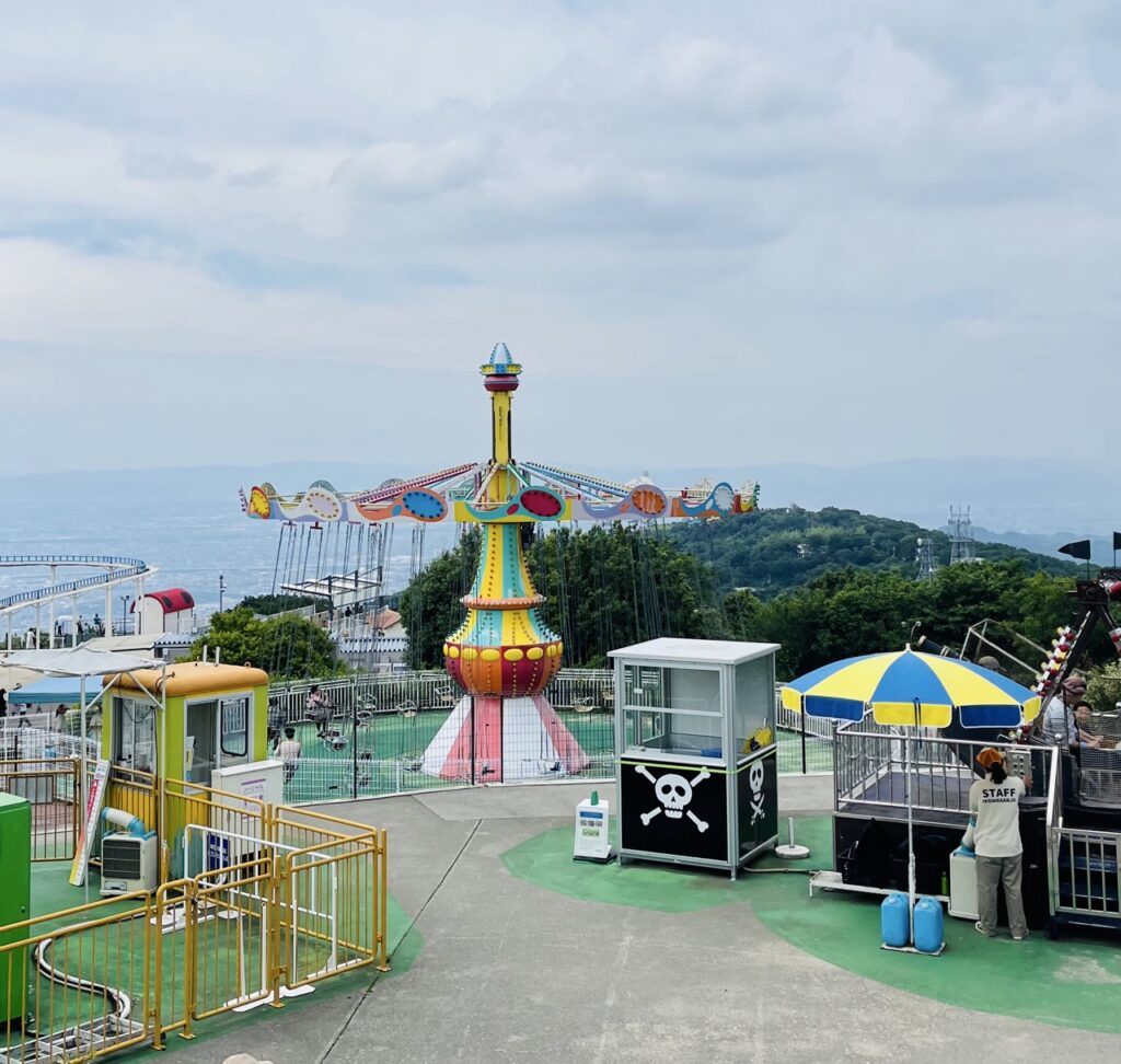 這座歷史悠久、被譽為日本最古老的大型遊樂設施「飛行塔」,高約20公尺,靜靜佇立在山頂。從塔上望去,奈良與大阪的風景一覽無遺,視野遼闊,令人心曠神怡。