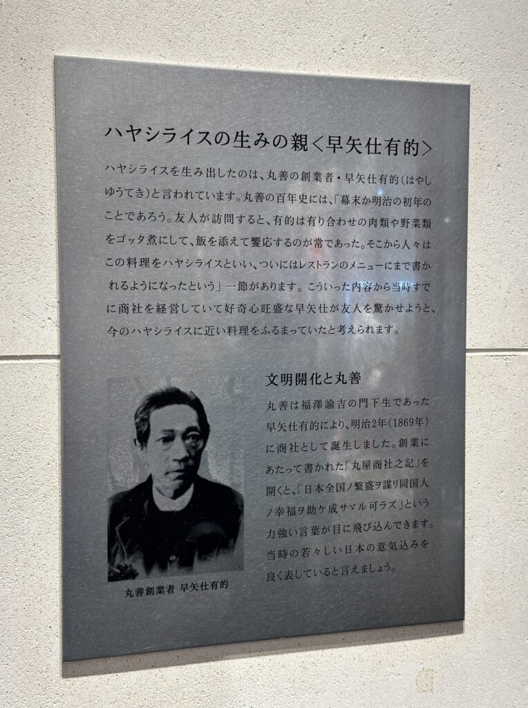丸善創立於明治2年(西元1869年),發展到今日,丸善成為一間以出版社、書店、印刷廠等文化產業為主的公司。在「丸善百年史」當中記載著,早在明治初年,丸善就在店裡開始販售這種紅酒燴牛肉飯,並且就叫做早矢仕燉飯(Hayashi Rice)。現在,丸善書店裡附設的餐廳,仍販售著用百年祕方,烹飪出經典的紅酒燴牛肉飯。