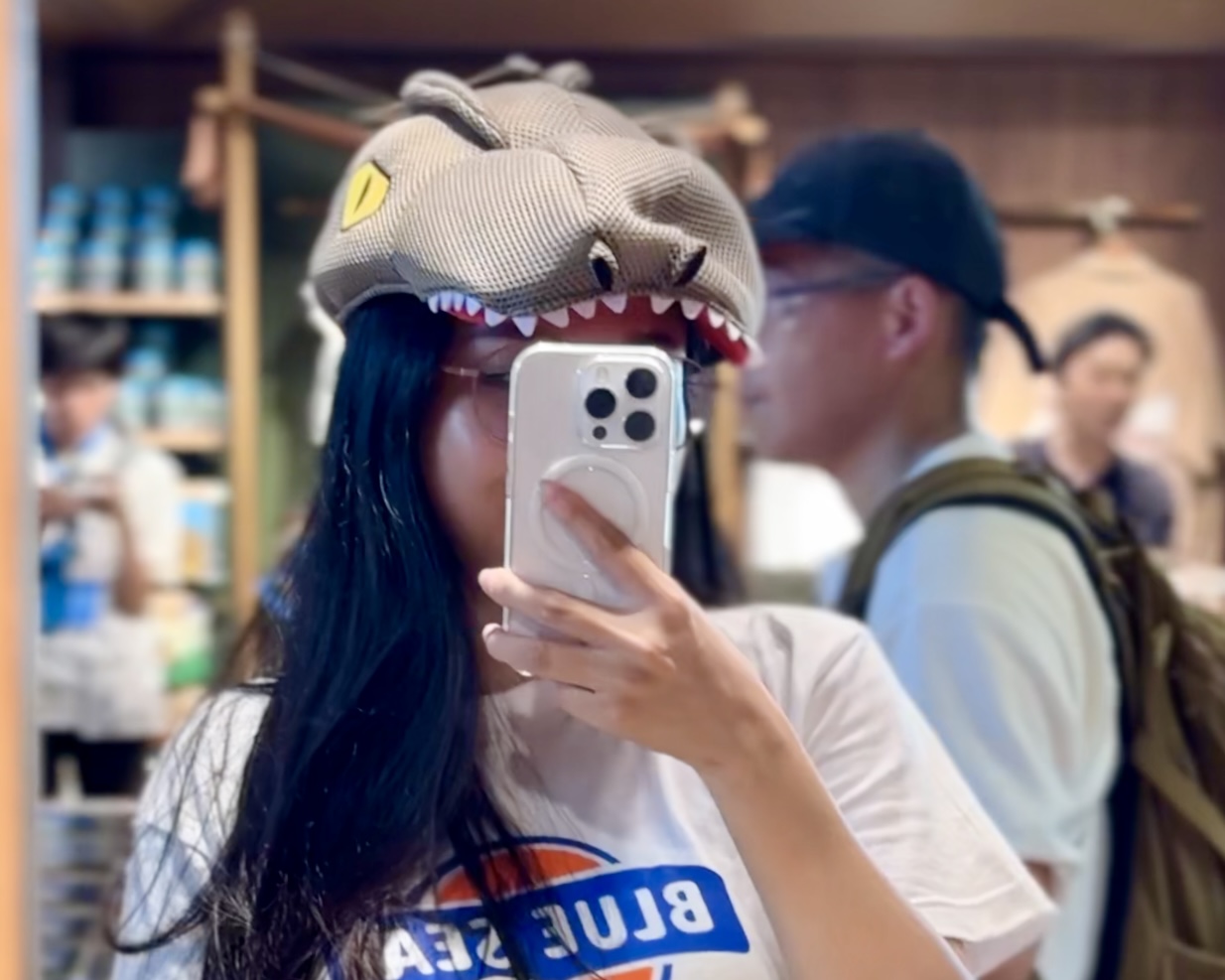 JUNGLIA OKINAWA 暴龍造型毛絨帽戴起來的樣子|Tsubaki攝影