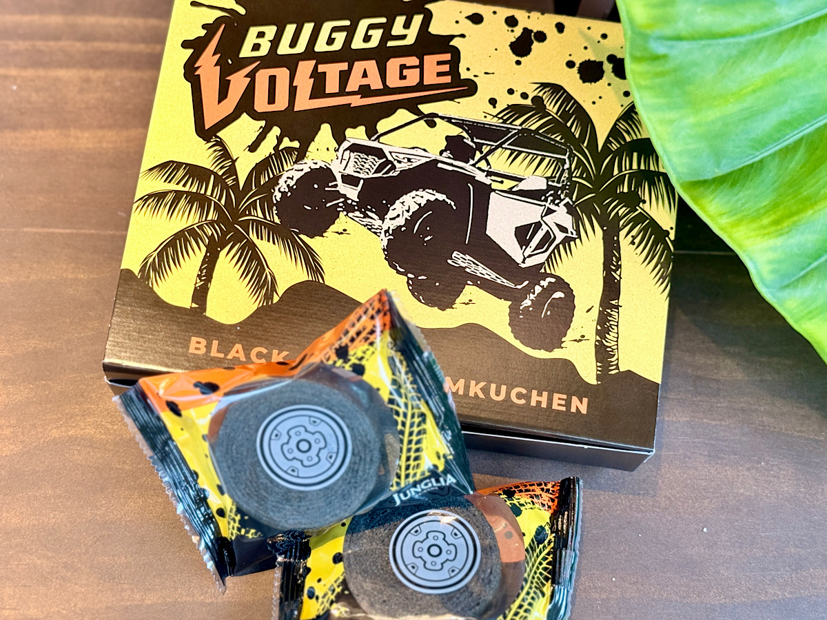 靈感來自園區內的越野車遊樂設施,這款輪胎造型的年輪蛋糕可說是 JUNGLIA 原創伴手禮中最具趣味與代表性的一款。設計上模擬越野車在崎嶇地形上疾馳的粗獷感,外觀厚實有份量,強烈的視覺印象讓人一看就印象深刻。