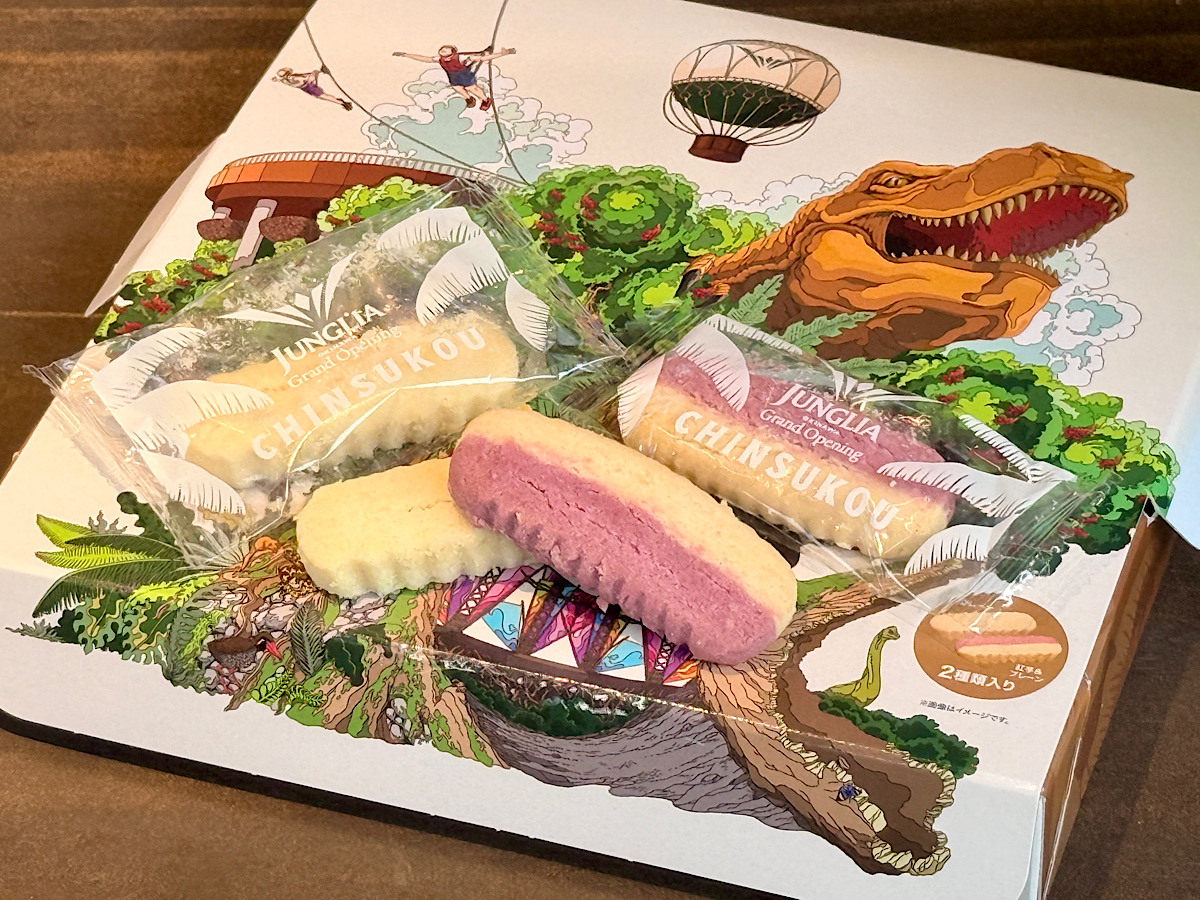 外包裝上印有恐龍與遊樂設施等 JUNGLIA 標誌性的設計,充滿叢林探險的氛圍,無論是送禮還是自己帶回家食用也都非常合適!