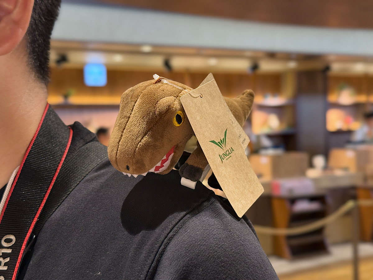 一踏進小賣店,小編的目光馬上就被這款超有存在感的絨毛恐龍肩騎玩偶吸引!這款玩偶設計成一隻小恐龍趴在你肩膀上的樣子,雙手附有可夾式扣具,可以穩穩地固定在肩膀或包包上,讓你瞬間變身恐龍好夥伴,一路在園區穿戴遊玩。