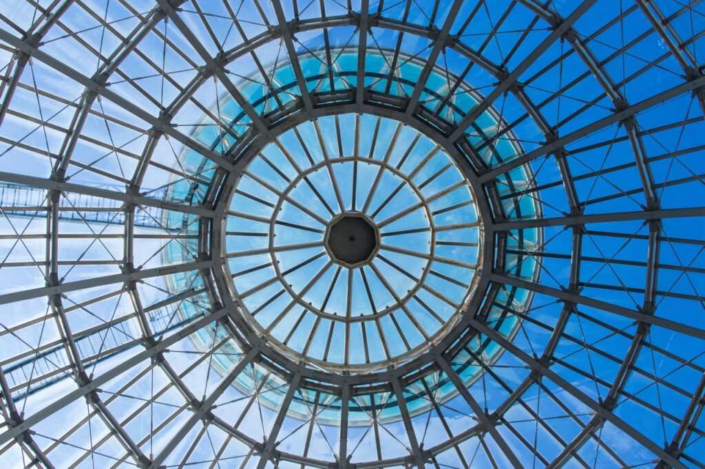 商店街中央最吸睛的地標是「巨蛋廣場」,上方有著高挑通透的圓頂玻璃屋頂,白天映入自然光線,夜晚則打上燈光,極具設計感。抬頭仰望,能看見圓弧天幕在城市光影下變換顏色,成為許多旅人拍照打卡的亮點之一。