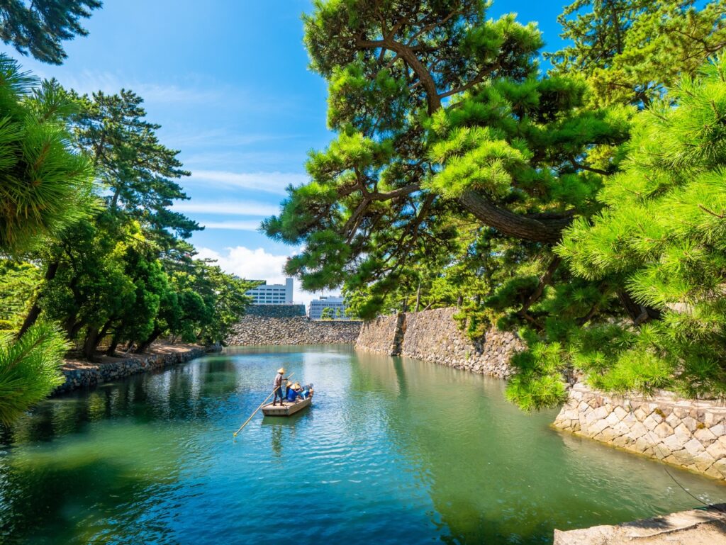 一大特色是園區內提供「乘船遊堀」體驗,搭乘小舟繞行護城河,從水面視角觀察城郭與石垣結構,深受外國旅人與攝影愛好者喜愛。
