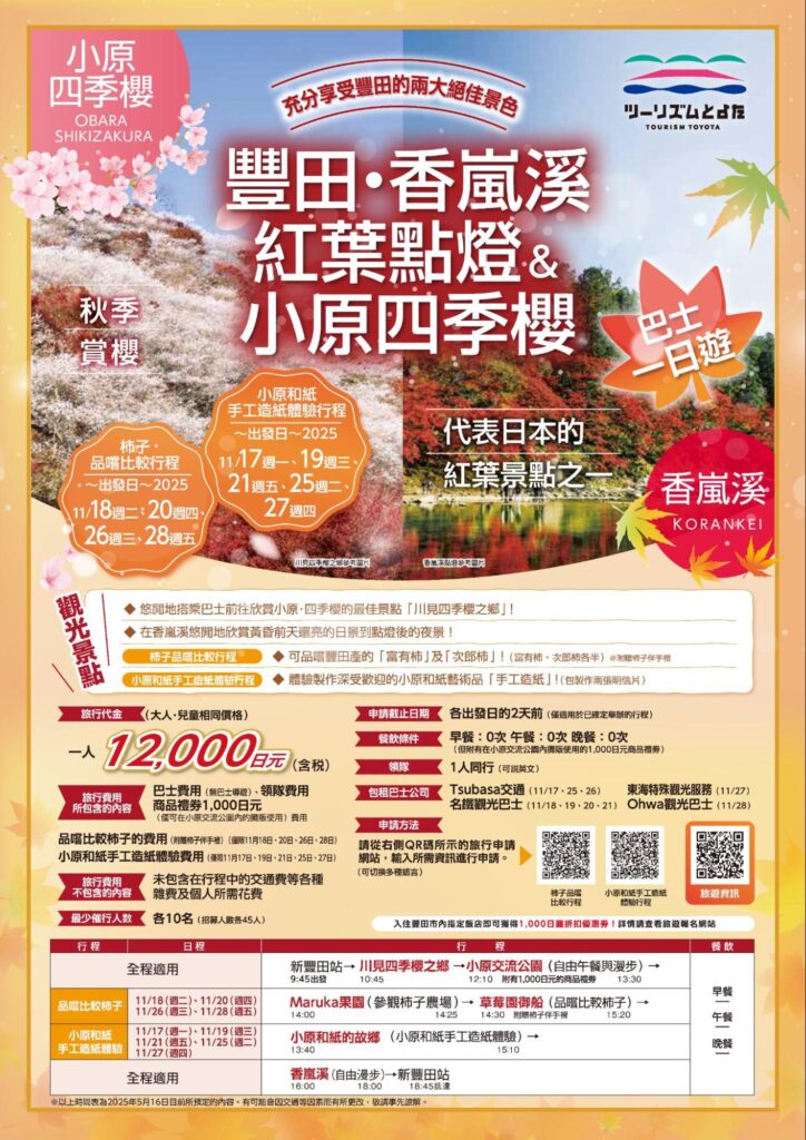 如果你也曾因為交通不便而錯過這段美景,不用再猶豫!2025 年秋天,「豐田・香嵐溪紅葉點燈&小原四季櫻巴士一日遊」再度登場。不僅從豐田市發車的專車直達、行程舒適,還能從兩種路線中自由選擇,可以動手做和紙、大啖現摘柿子,盡情體驗豐田市的文化與自然。