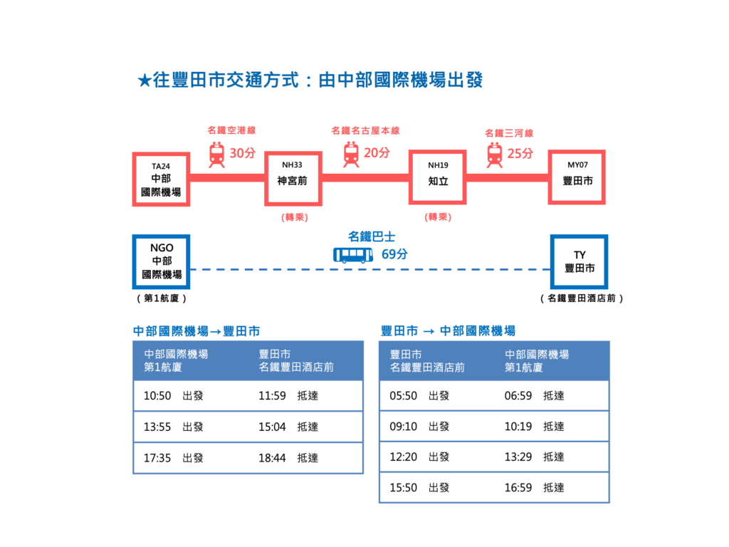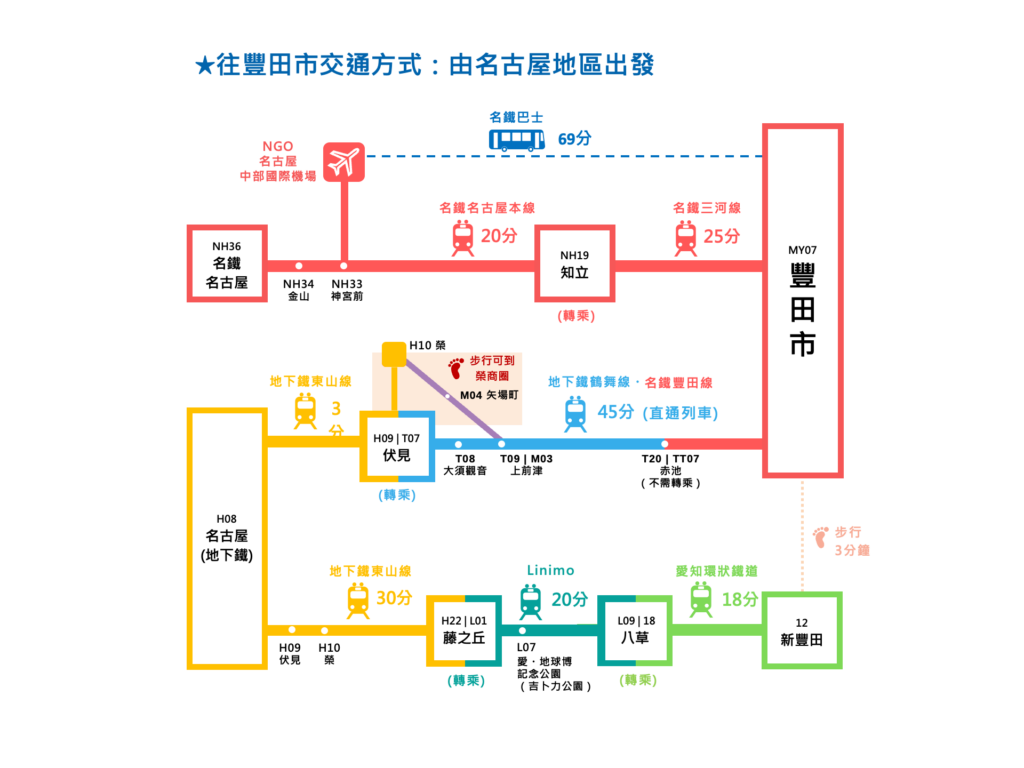 最省時路線 搭乘名鐵至「知立站」轉乘,約 1 小時可抵達「豐田市站」。