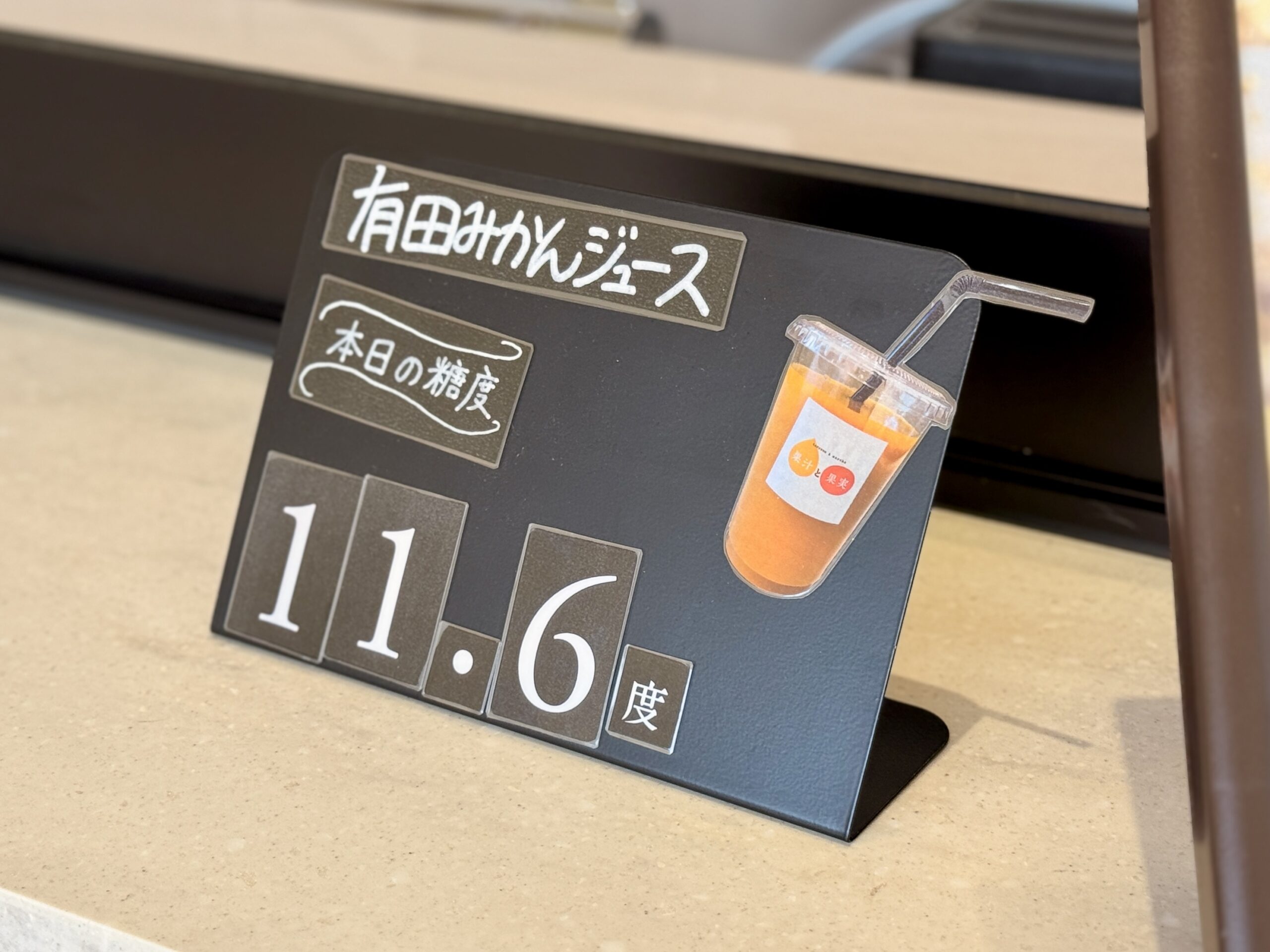 而且很有趣的是店裡的蜜柑果汁甜度都是根據當日採用的蜜柑製成的,在點餐窗口一旁還可以看見一旁的「今日甜度」告示牌,非常可愛。
