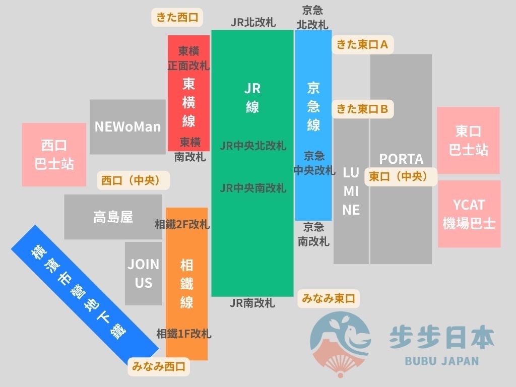 橫濱站主要分成「西口」與「東口」兩大生活圈,再配合 JR 的「北改札/中央北改札/中央南改札/南改札 」等來分流。想逛百貨東西兩個出口都有,餐飲店、熱鬧地帶,多半集中在西口;要搭機場巴士 YCAT,請找東口。